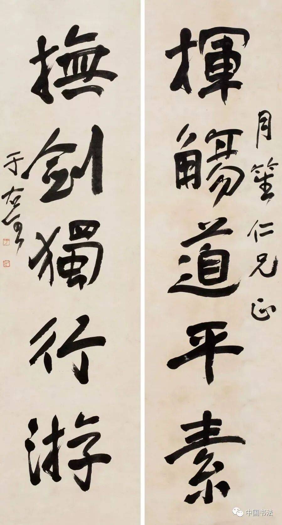 于右任的这幅字写的是挥觞道平素,抚剑独行游。分别出自陶渊明的《咏二疏》和陶渊明《拟古 其八》。藏巧于拙,天姿烂漫。