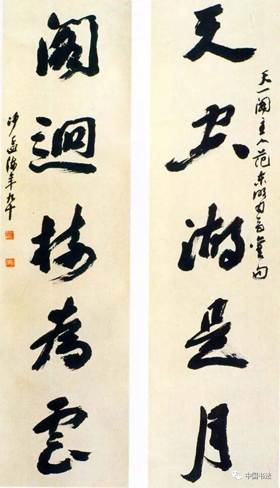 沙孟海的这幅作品写的是天空湖是月,阁回树为云。雄健浑厚,很有意思。空字看着觉得有点不太舒服。